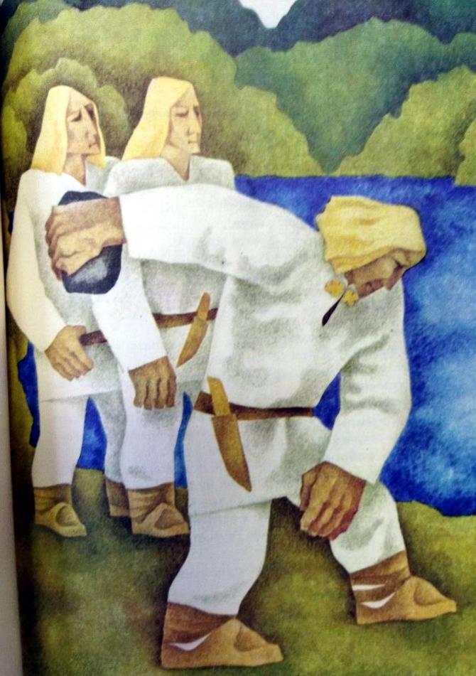 Но младший сын молвил: — Не свататься мы пришли. Другие дороги нас ждут и другие заботы. Зашагали братья дальше и на третий день вышли к берегам красивого озера. — Вот тут и кинем жребий, лучшего места не сыщешь, — молвил старший брат. — Увидим, кому из троих суждено быть правителем. Каждый подыскал себе подходящий камень, и братья приготовились к состязанию. Тот, чей камень полетит дальше всех, наследует вотчину старого Калева, станет правителем и заступником народным. |