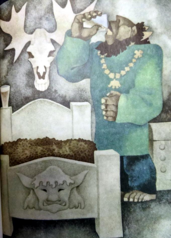 Поутру, ещё до зари, пустился «Летучий» в плаванье, держа путь на север. Именно там — как сказывали мудрецы — находится край света. У кормила встал знахарь слов, который понимал языки птиц, животных и людей. Корабль был в пути уж несколько дней, как вдруг попал в сильный шторм. Это финские бесы подняли ветер и взволновали море. «Летучий» то взмывал на гребень волны, то падал в пучину, Тёмные тучи закрыли солнце и звёзды, даже мудрый кормчий не сумел больше управлять кораблем. Семь дней и семь ночей бушевал шторм. Но, наконец, бесы устали и угомонились. Солнце опять засветило, а вдали показались очертания неведомой земли. Когда «Летучий» подплыл поближе к берегам, Калевипоэг прыгнул в воду и пустился вплавь. А потом он притянул корабль к берегу. То была не страна Суоми и не Турия. Никто ещё здесь не бывал. Знахарь слов окликнул ласточек, и они ответили, что корабль пристал к берегу Лапу*, что это холодная темная северная страна, где живут знаменитые мудрецы и колдуньи. Калевипоэг взял с собой знахаря слов и двух верных друзей, и они вчетвером отправились осматривать незнакомые места. 70 * Лапу — Лапландия, страна лопарей, саамов. |