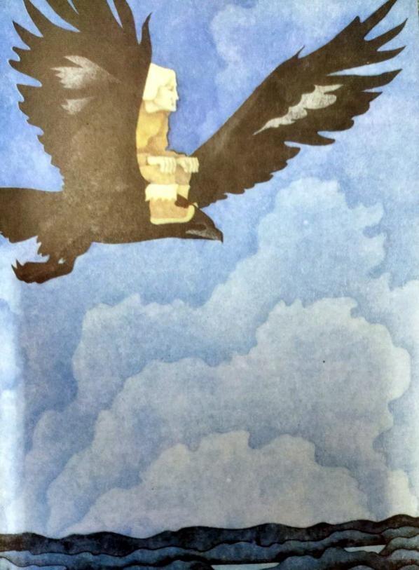 Вдова подхватила курицу под мышку, яйцо тетёрки спрятала за пазуху, а воронёнка завернула в передник. Дома она положила яйцо в корзину с шерстью, а курицу усадила сверху. Воронёнка же кинула за сундук, в кошачий угол.