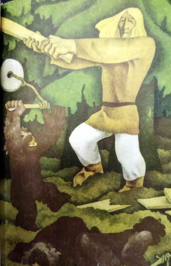 Воротился богатырь на берег Чудского озера, взвалил доски на спину и зашагал к дому. Проходя по лесу, он сломал сосенку для дубинки, чтобы вместо меча отгонять ею с дороги врагов.