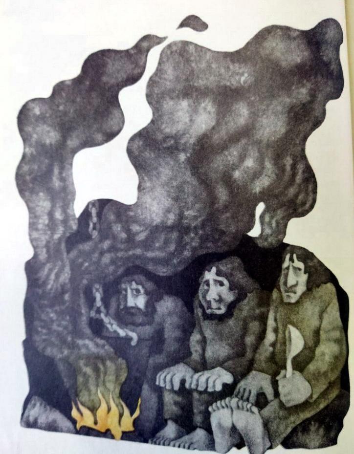 И вот стало ему досаждать сновидение. Увидел он, будто чудо-кузнец Ильмарине со своими семью подмастерьями кует в пещере отменный меч. Но тут подходит к ним покойный сын финского кузнеца и говорит: