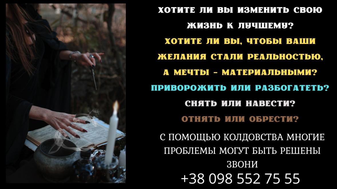 Предлагаю различные чистки и снятие всех видов порчи и проклятий, сглаза, подселенцев. Мои услуги включают чистку жилья, офиса, автомобиля, а также предсказания на черном зеркале судеб. Практикую женскую магию и ритуалы на омоложение, на красоту для женщин и мужчин. Открытие денежного потока, привлечение денег, удачи, клиентов и помощь в продаже недвижимости также входят в мой арсенал. Я работаю с духами предков, использую вольты для устранения болезней в мире мертвых и взаимодействую со стихиями. Изготавливаю индивидуальные амулеты для каждого человека и устанавливаю семиглавые защиты. Мои методы проверены временем, и они помогут вам наладить отношения в паре, создать позитивный фон в семье, привлечь внимание второй половинки, возродить утраченные чувства, страсть и желание. Если ваша жизнь принимает нежелательный оборот, пришло время начать над ней работать! Я постараюсь помочь вам в решении запутанных, сложных жизненных ситуаций и привнести свет, добро, мир и порядок в ваш дом и семью. +38 098 455 84 44 +38 067 771 63 89 |