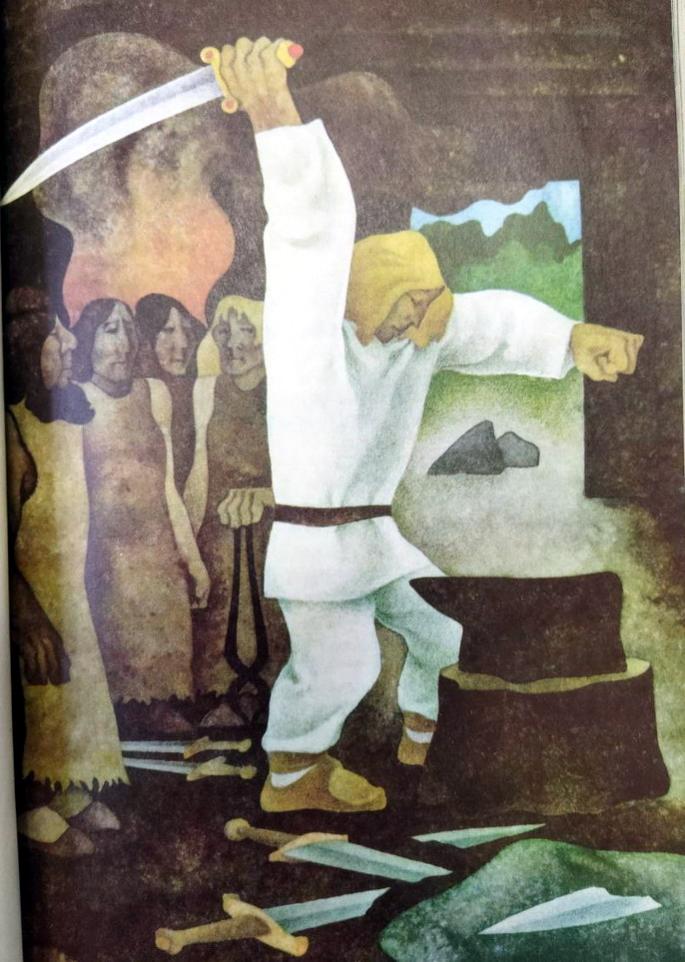Калевипоэг зашагал, куда было сказано, пока до его ушей не донёсся вздох мехов и грохот тяжёлых молотов. Вдали, посреди долины, под деревьями расположилась кузница. Знаменитый кузнец ковал со своими тремя сыновьями огромный меч. Мужчины были черны от сажи и так били по раскалённому острию, что оно повизгивало под ударами молота.