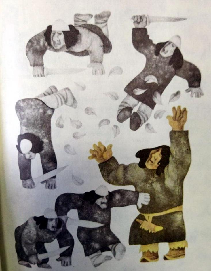 Недалеко от дома шумела пышная дубрава. Богатырь на-правился к ней и вырвал с корнем самый могучий дуб. Он очистил ствол от ветвей, получилась крепкая дубинка — в самый раз, чтобы отдубасить Туслара. Снова направился он к дому злодея, с могучим оружием в руках. От шагов богатыря сотрясалась земля, дрожали горы и гудели скалы. Туслар, очнувшись от сна, подумал, что это грохочет Гром, разъезжая по небу в своей железной колеснице. Но тут он увидел, что во двор входит Калевипоэг. Туслар не успел спрятаться, он выхватил из-за пазухи при-горшню перьев, подул на них — закружились они в воздухе. Стал он нашёптывать колдовские слова, которые превратили перья в солдат. И напали они на Калевипоэга, кто пеший, кто конный. Облепили его со всех сторон, будто комары. Тут Калевипоэг пустил в ход свою дубинку. |